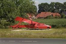 Direkt an der neuen Umgehungsstraße von Schöppingen verliert ein Automobil die Bodenhaftung. Die Skulptur des Stuttgarter Künstlers Stefan Rohrer fällt auf, verwundert, amüsiert und lenkt den Blick des Vorbeifahrenden vielleicht auch für einen Sekundenbruchteil erschrocken ab.