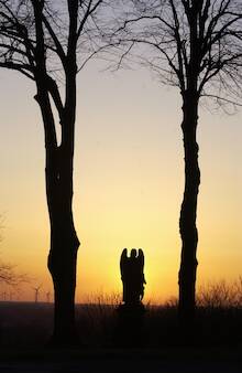 Erhaben posiert auf einer Anhöhe des Schöppinger Berges unter vier alten Linden, erhöht durch einen Sockel aus Stein, die vollplastische Darstellung eines Engels, der seine Hände beschützend auf die Schultern eines Mädchen und eines Jungen legt und mit seinen alles erfassenden Augen auf die schöne Parklandschaft rund um Schöppingen herabblickt.